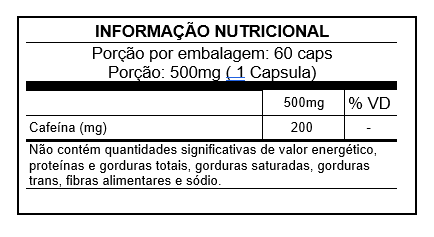 Ingredientes: Cafeína Anidra,  Amido de milho,  antiumectante dióxido  de silicio (INS 551)