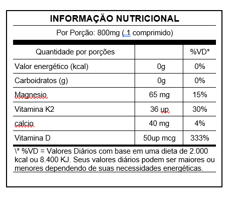 INGREDIENTES: Tapioca, fosforo cálcio, colecalciferol, magnésio vit. K2. Veículo: micro celulose, esteato de magnésio, dióxido de silício coloidal.