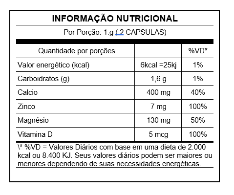 INGREDIENTES: Carbonato de cálcio, sulfato de magnésio, maltondextrina, sulfato de zinco. Capsulas: Gelatina.