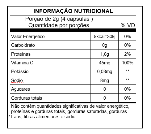 Ingredientes: Colágeno Hidrolisado em pó, acido ascórbico, antiumectante dióxido de silício. Composição da Capsula: Gelatina.