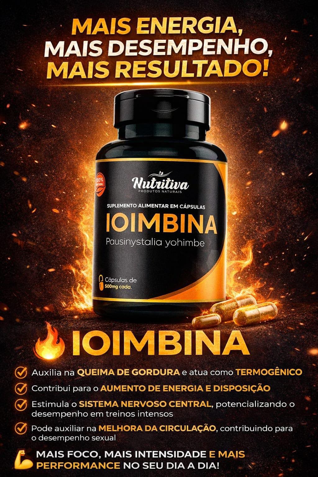 A Ioimbina em cápsulas é utilizada principalmente para auxiliar na queima de gordura localizada (especialmente abdômen e coxas) e no tratamento da disfunção erétil, devido ao seu efeito de aumento do fluxo sanguíneo e bloqueio de receptores de gordura. Ela funciona como termogênico, elevando o gasto energético e a noradrenalina.