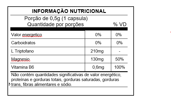 Ingredientes: L Triptofano, Magnésio, Vitamina B6 (cloridrato Piridoxina) Veiculo: Maltodextrina , Antiumectante, nutricionista ou médico.¨. Cápsula: Água purificada, gelatina.