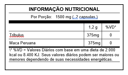Ingredientes: Tribulus, maca peruana Cápsula: gelatina.