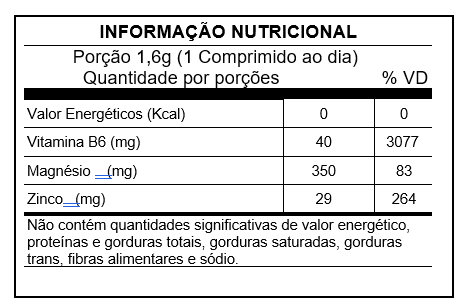 COMPOSIÇÃO: Oxido de magnésio, cloridrato de piridoxina, oxido de zinco, amido de milho,. Antiumectitantes: carbono de cálcio, dióxido de silício, e estearato de magnésio. Glaceantes: Hidroxipropimetilcelulose e Polietilenoglicol. Estabilizantes: Polivinilestabilizantes: Polivinilpirrolidona,e corrante dióxido de titânio.